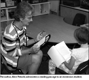 To create these more program-appropriate norms, entire grade levels of immersion students are tested for reading fluency and math computation once every three years. Results are analyzed to determine a median score and then used to establish immersion specific norms. Students qualify for special education services only if they are at least two times discrepant (i.e., they make twice as many errors as their peers) in both English and the immersion language.This methodology is adapted from the district’s model of assessing English language learners, in use since 1990. The model requires quite a bit of planning and time initially, but we find that it leads to more accurate placement decisions in the end.